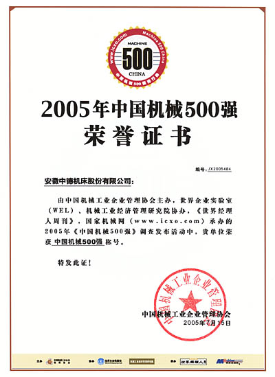7月15日,2005年《中國(guó)機(jī)械500強(qiáng)》在北京人民大會(huì)堂隆重發(fā)布。其中一汽、上汽、中國(guó)兵器裝備集團(tuán)公司等50家上榜企業(yè)同時(shí)入選2005《世界機(jī)械500大》。此次活動(dòng)是由中國(guó)機(jī)械工業(yè)企業(yè)管理協(xié)會(huì)主辦,世界企業(yè)實(shí)驗(yàn)室、機(jī)械工業(yè)經(jīng)濟(jì)管理研究院協(xié)辦,世界經(jīng)理人周刊和國(guó)家機(jī)械網(wǎng)聯(lián)合承辦的。此次評(píng)選中,金屬加工機(jī)械制造行業(yè)有19個(gè)企業(yè)入選;安徽省共有16個(gè)企業(yè)入選;馬鞍山市入選的有2家企業(yè)(除我公司外,還有星馬汽車股份有限公司進(jìn)入了500強(qiáng)企業(yè));在500強(qiáng)企業(yè)中我公司位列第484位。