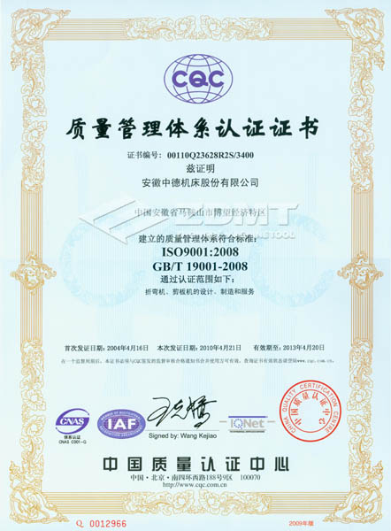 2010年4月,我公司順利通過了ISO 9001:2008版換證復審,獲得認證證書(證書編號:00110Q23628R2S/3400)。在此次復審過程中,中國質(zhì)量認證中心(CQC)對我公司的質(zhì)量體系運行情況進行了全方位嚴格審核,并對中德公司質(zhì)量管理工作給予了充分的肯定。
